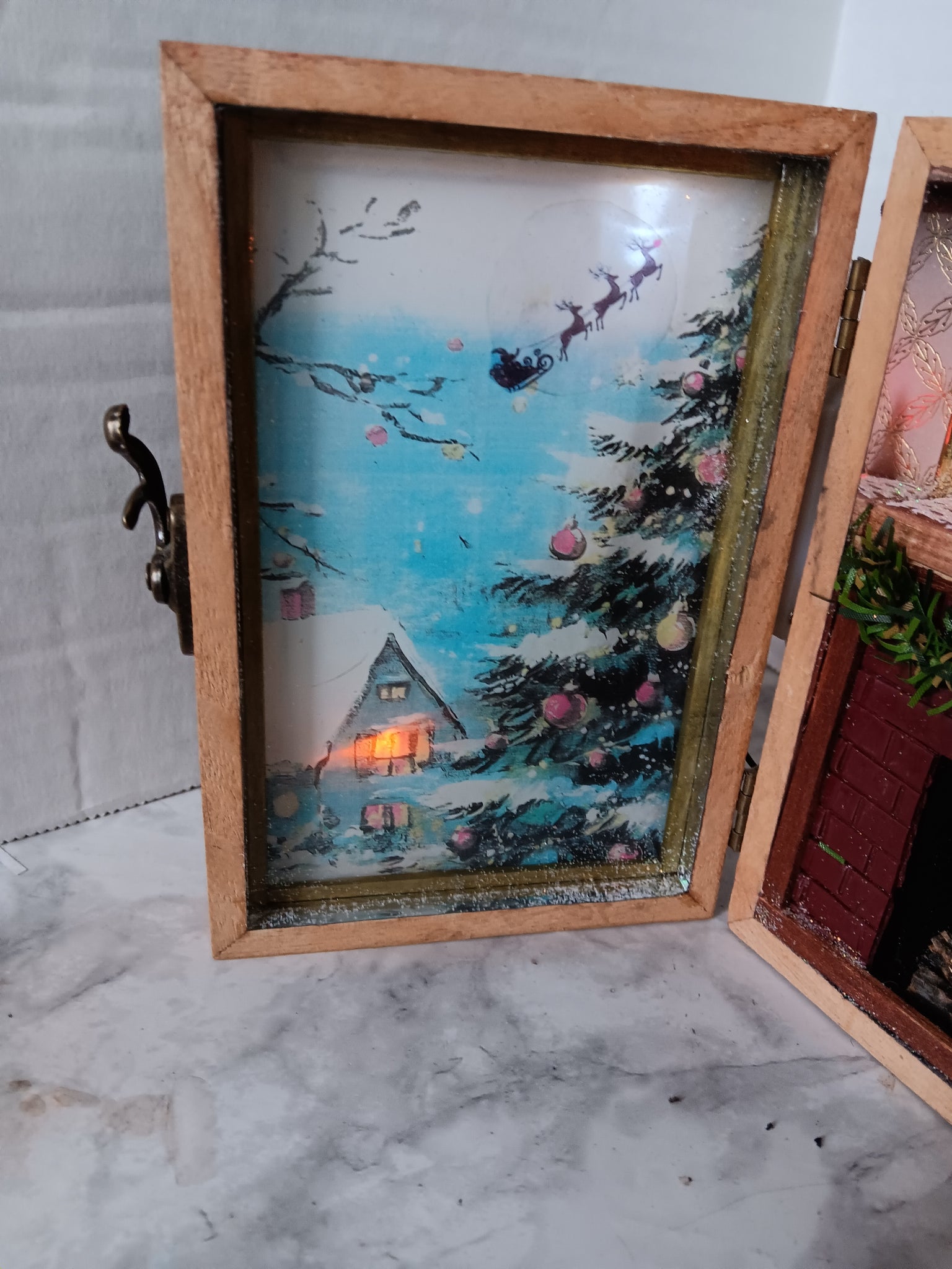 The bookbox that started them all. "’Twas the Night Before Christmas" presents a meticulously crafted miniature scene that aims to capture the warmth and enchantment of the renowned holiday poem. This concept originated with my initial creation—a vintage Christmas box featuring Santa on the front, which was received for storing treasured items. Inspired by this box and the poem, I conceptualized the bookbox as a unique form of diorama.