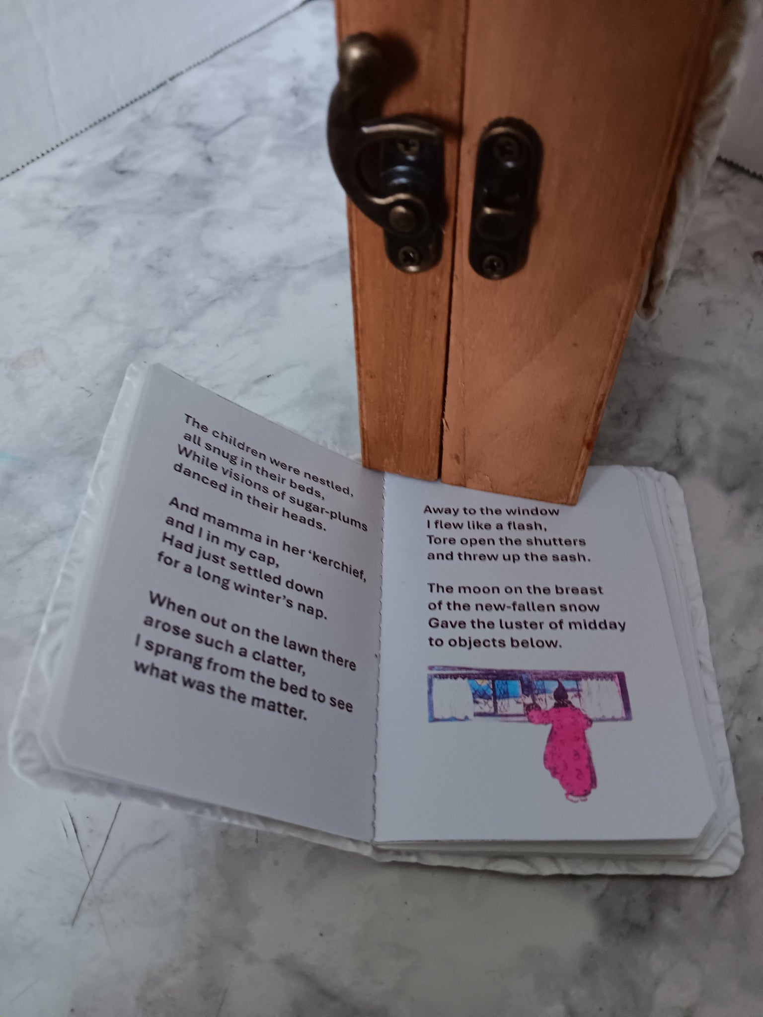 "’Twas the Night Before Christmas" holds particular significance for me, both as a cherished read-aloud for children and as a memorable narrative. This diorama bookbox was purposefully designed to reflect the magic and comfort associated with Christmas—the quietness of falling snow, the inviting glow of a fireplace, and the anticipation of forthcoming delights. The imagery evokes the universal childhood experience of drifting to sleep with visions of sugar plums.