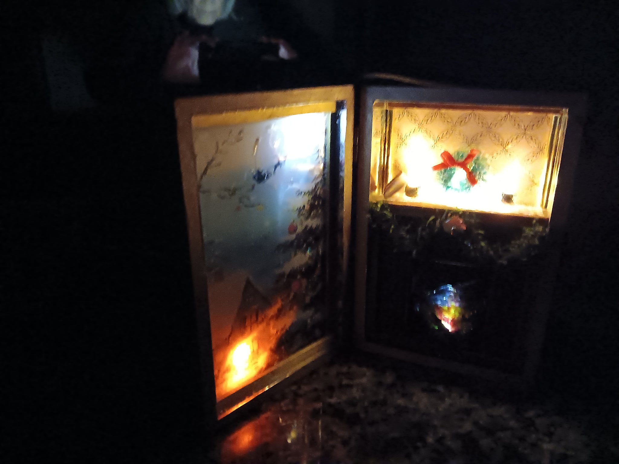 The fireplace has a flickering fire and when the lights go out the candles and fire continue to glow in the dark. Included is a miniature printed book of the poem.